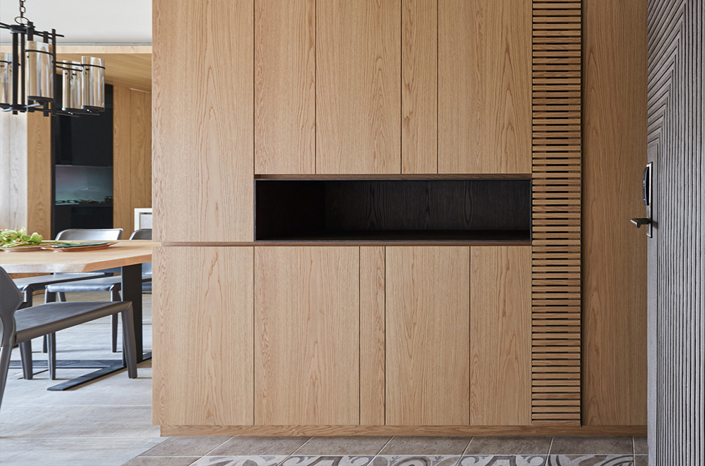 餐廳開放式的展示層板刻意薄化做出輕盈感,入口的鞋櫃搭配透氣需求結合木作造型格柵,